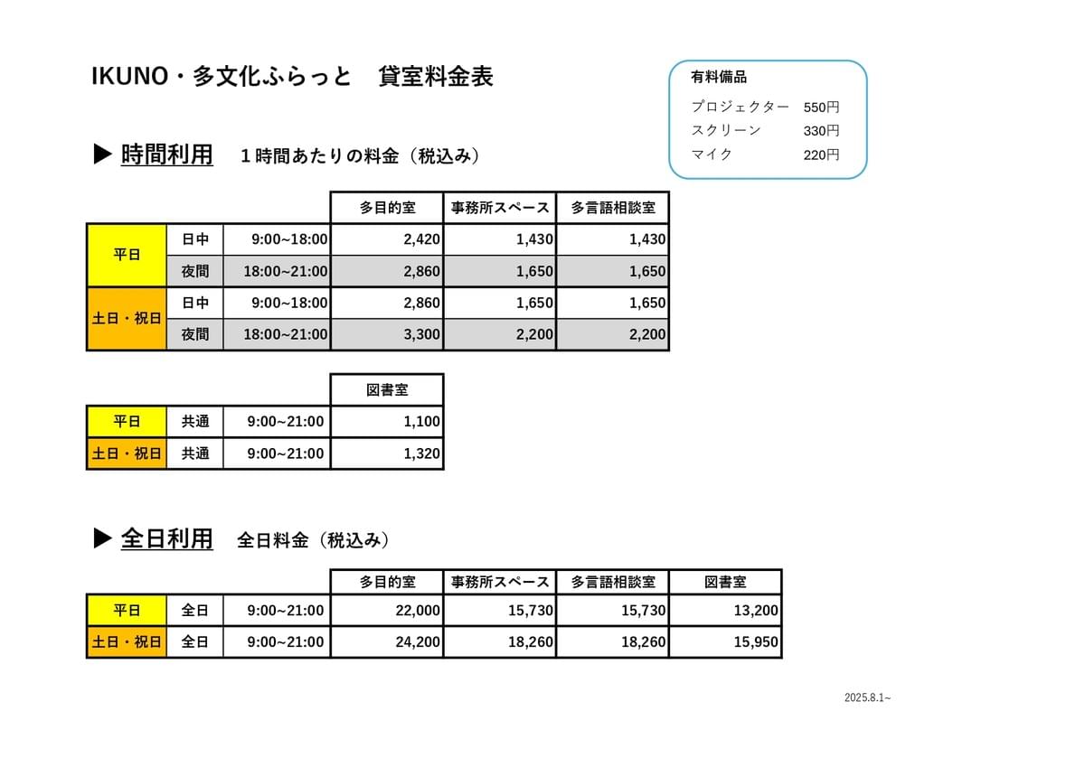 2.生野区内に事務所等をおく団体・個人による全日利用の場合は料金表の金額から2,000円を割引きます。